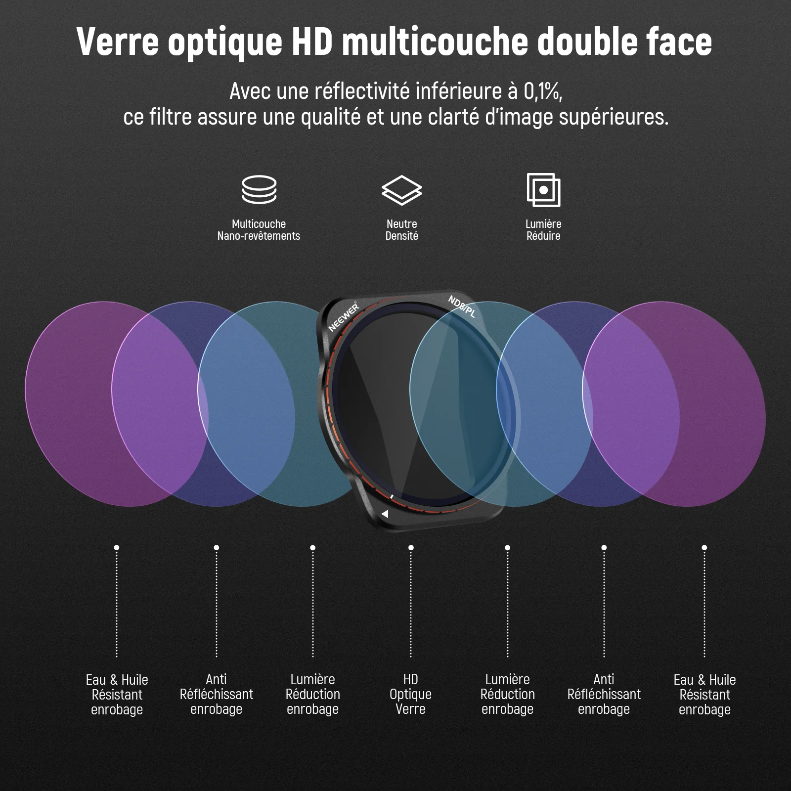 avec 30 couches de revêtements NANO multifonctionnels des deux côtés du verre optique HD, ces filtres sont hydrofuges, résistants aux rayures et à l'huile.