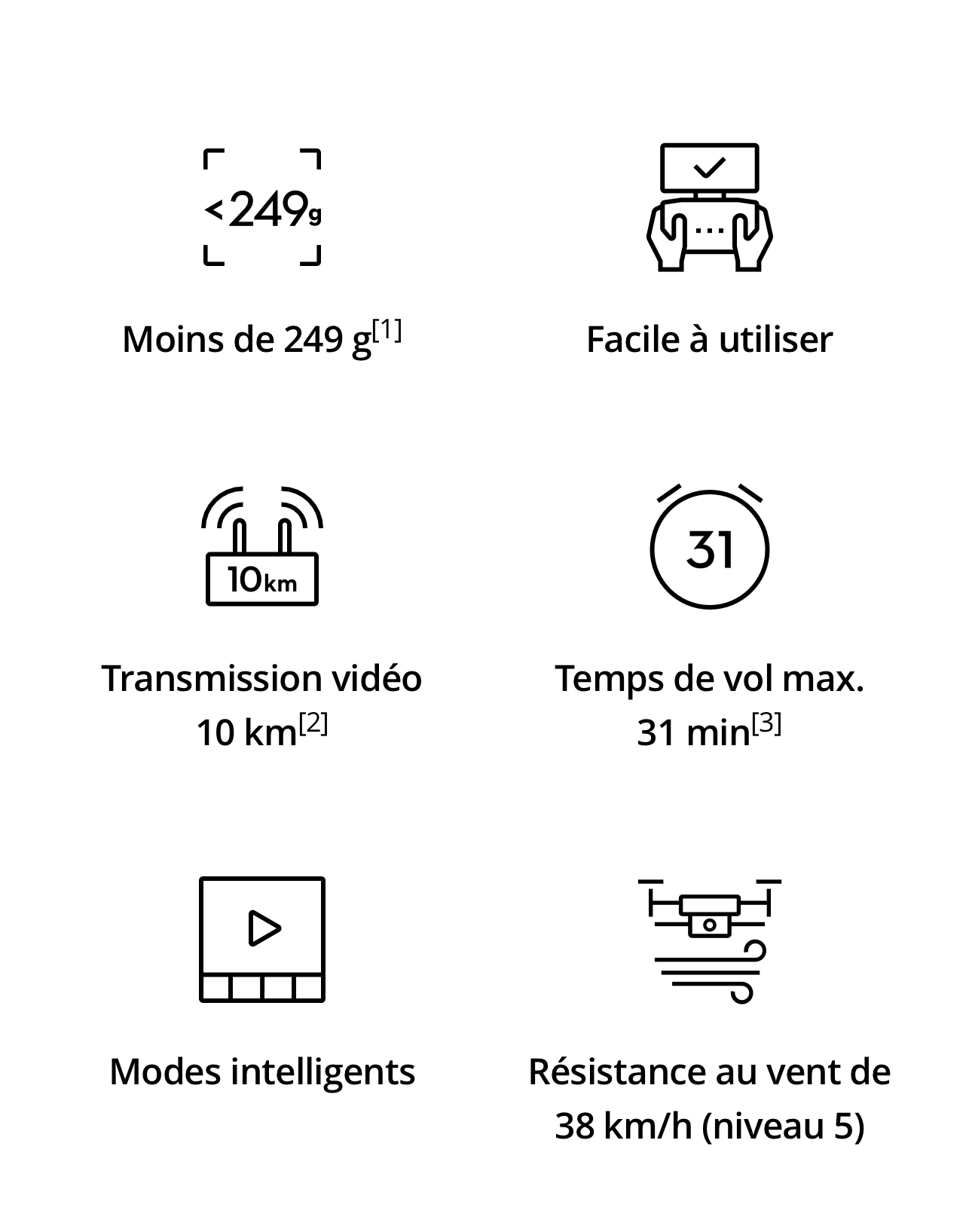 Léger (moins de 250 grammes), le Mini n'est petit que par sa taille ! Il est équipé d'une caméra 12 MP stabilisée, d'une belle autonomie de 31 minutes et profite de nombreux modes intelligents (QuickShots, Panorama, RTH etc.).