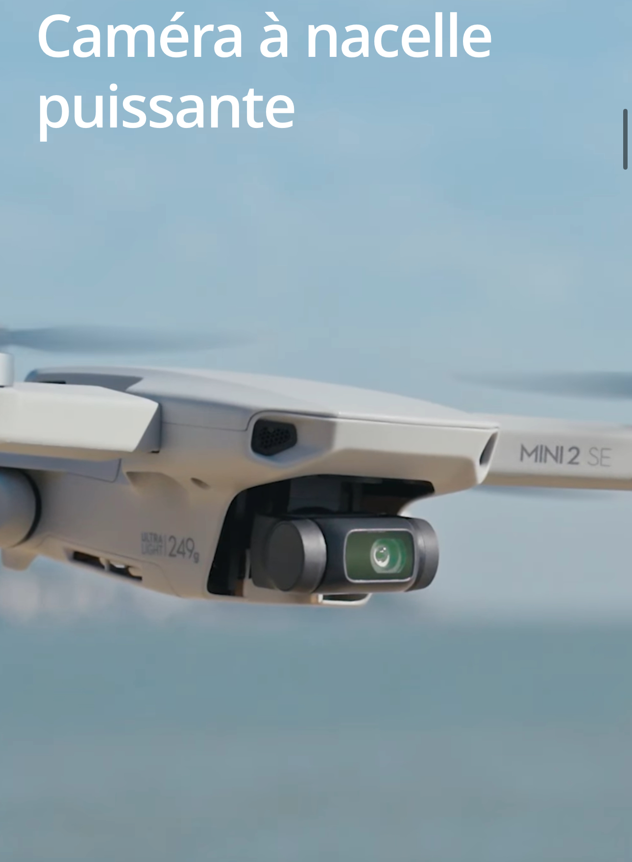 | Description | au maximum du drone DJI Mini 2 ! bidirectionnelle, un adaptateur secteur USB 18 W et un sac en bandoulière. Léger (moins de 250 grammes), le Mini n'est petit que par sa taille ! Il est équipé d'une caméra 12 MP stabilisée, d'une belle autonomie de 31 minutes et profite de nombreux modes intelligents (QuickShots, Panorama, RTH etc.). |