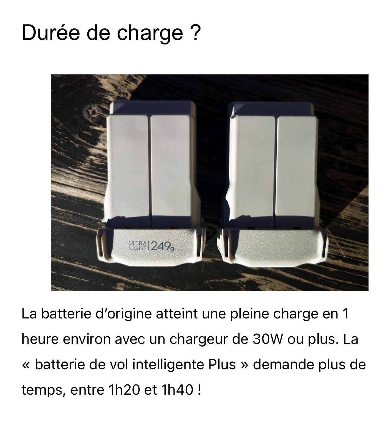 Temps de charge: 101 minutes (avec 30W USB-C chargeur et la batterie montée sur l'avion)