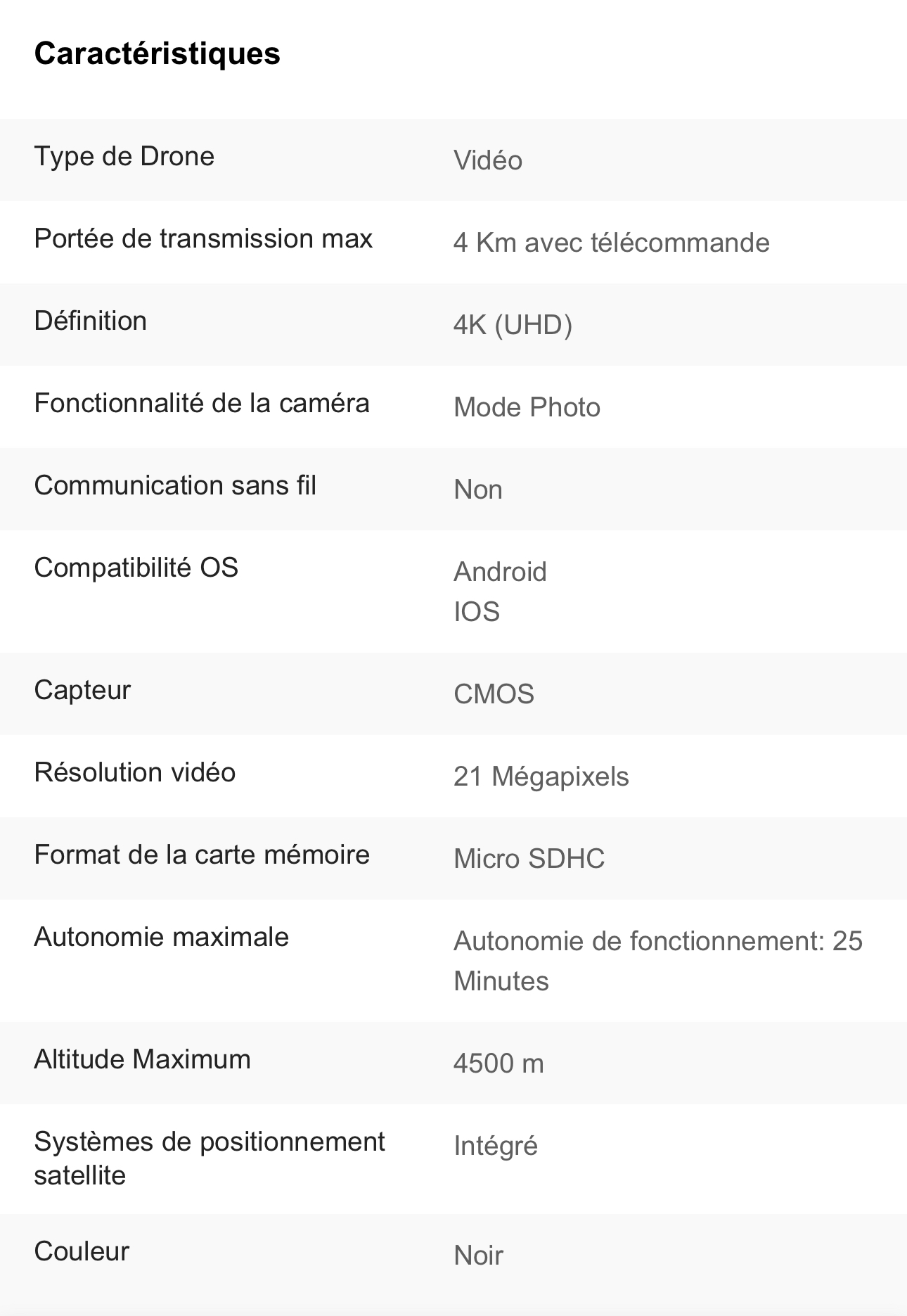 | Détails techniques | Vitesse horizontale max. : 15 m/s, Vitesse verticale max. : 4 m/s, Résistance au vent max. : 50 km/h, Plafond pratique : 4500 m au dessus du niveau de la mer, Température de fonctionnement : de -10°C à 40°C ; |