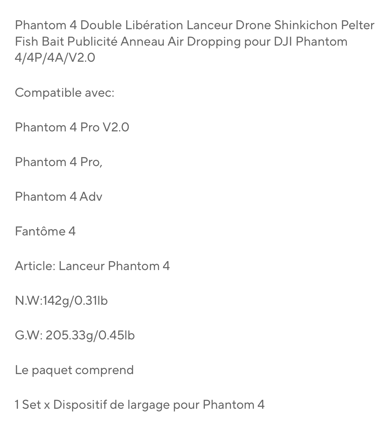 | Nom de l'article | Système de largage pour DJI phantom 4 Pro |